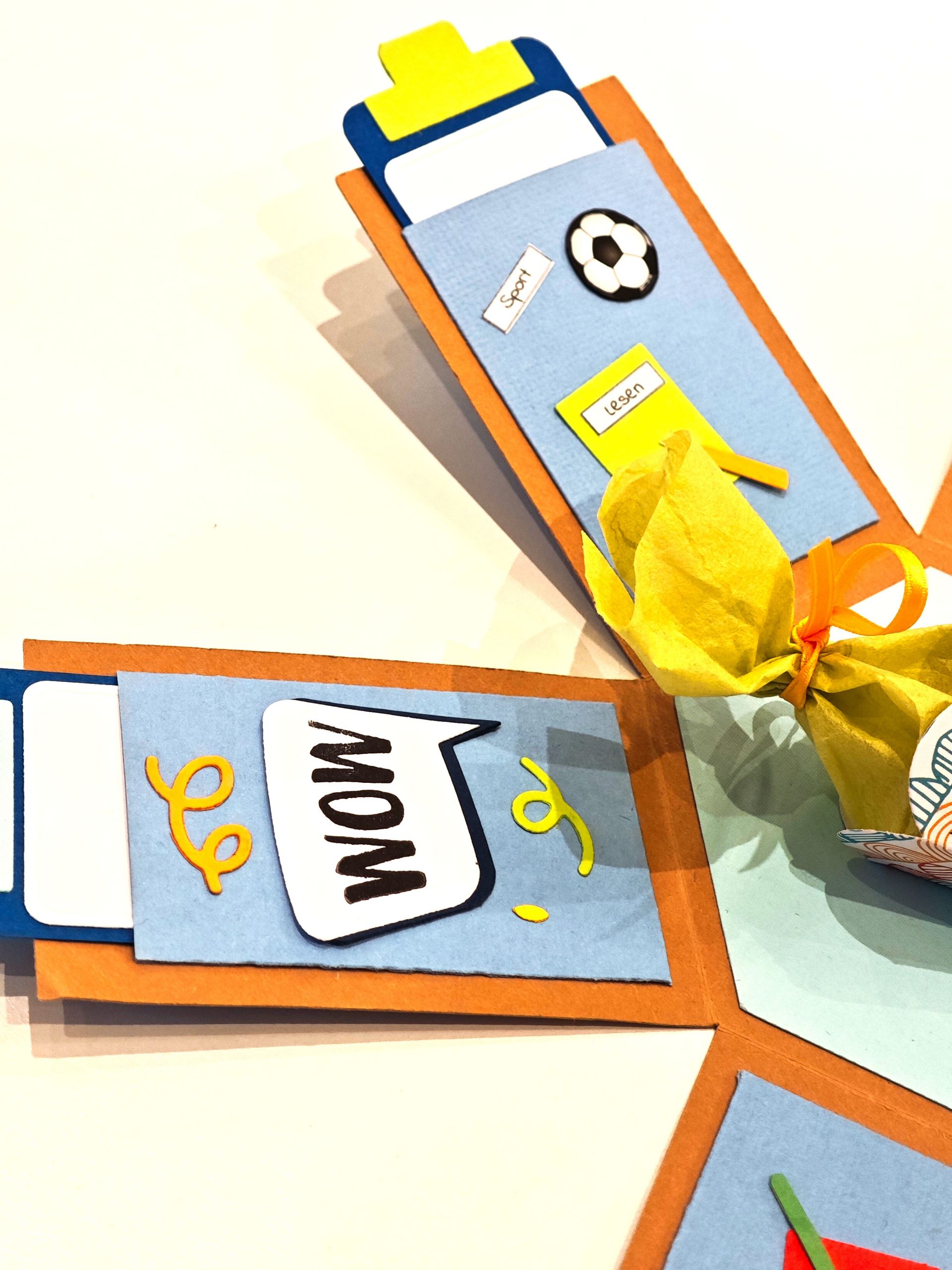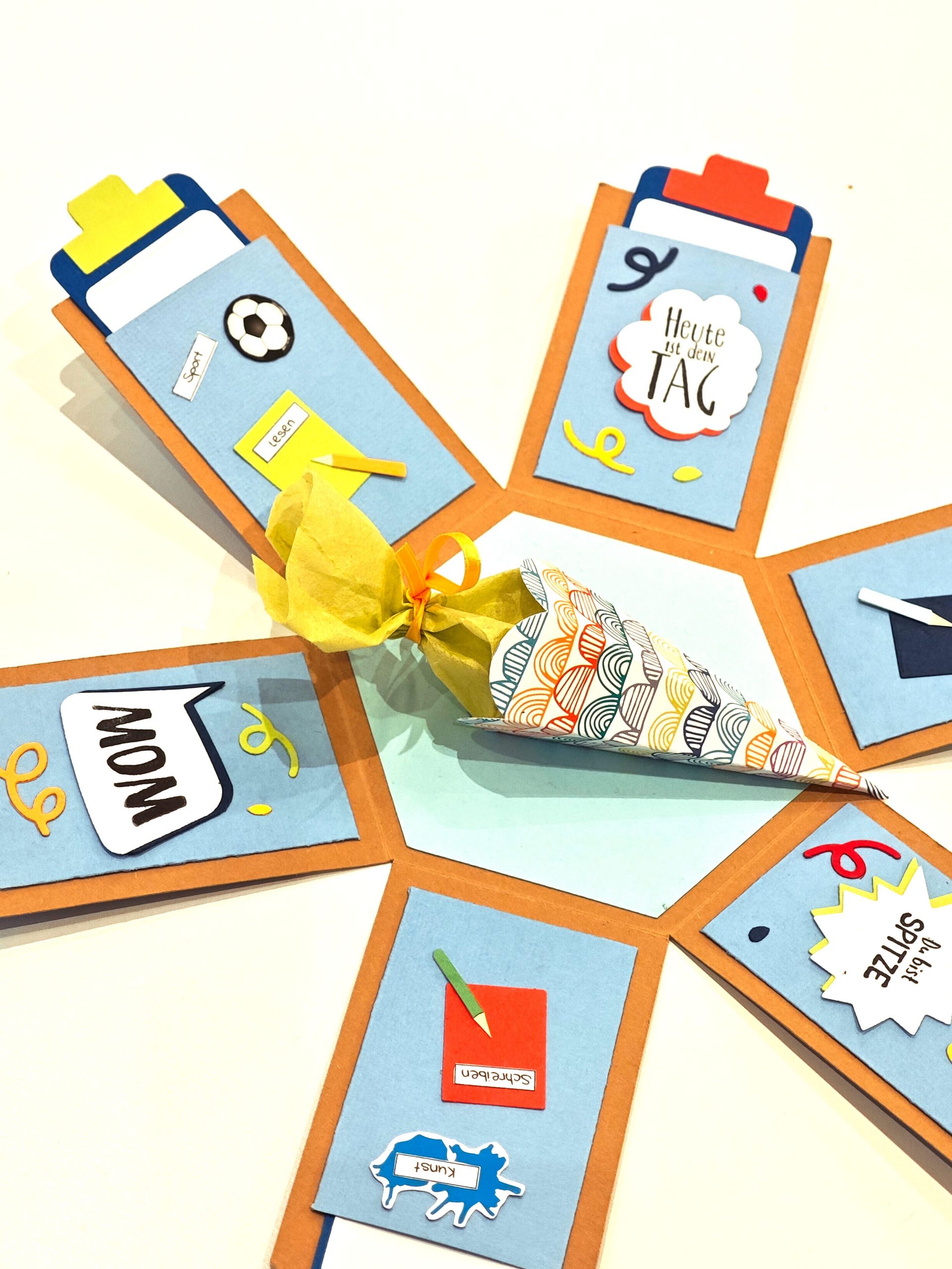 0 By tanja 12/02/2025 Explosionsbox zur Einschulung Vorgabe zu dieser Box war: für einen Jungen zur Einschulung, Platz für einen Gutschein und/oder Fotos. Benutztes Material: verschiedenste Papiere, 3D-Schmuckelemente, eine kleine Schultüte
