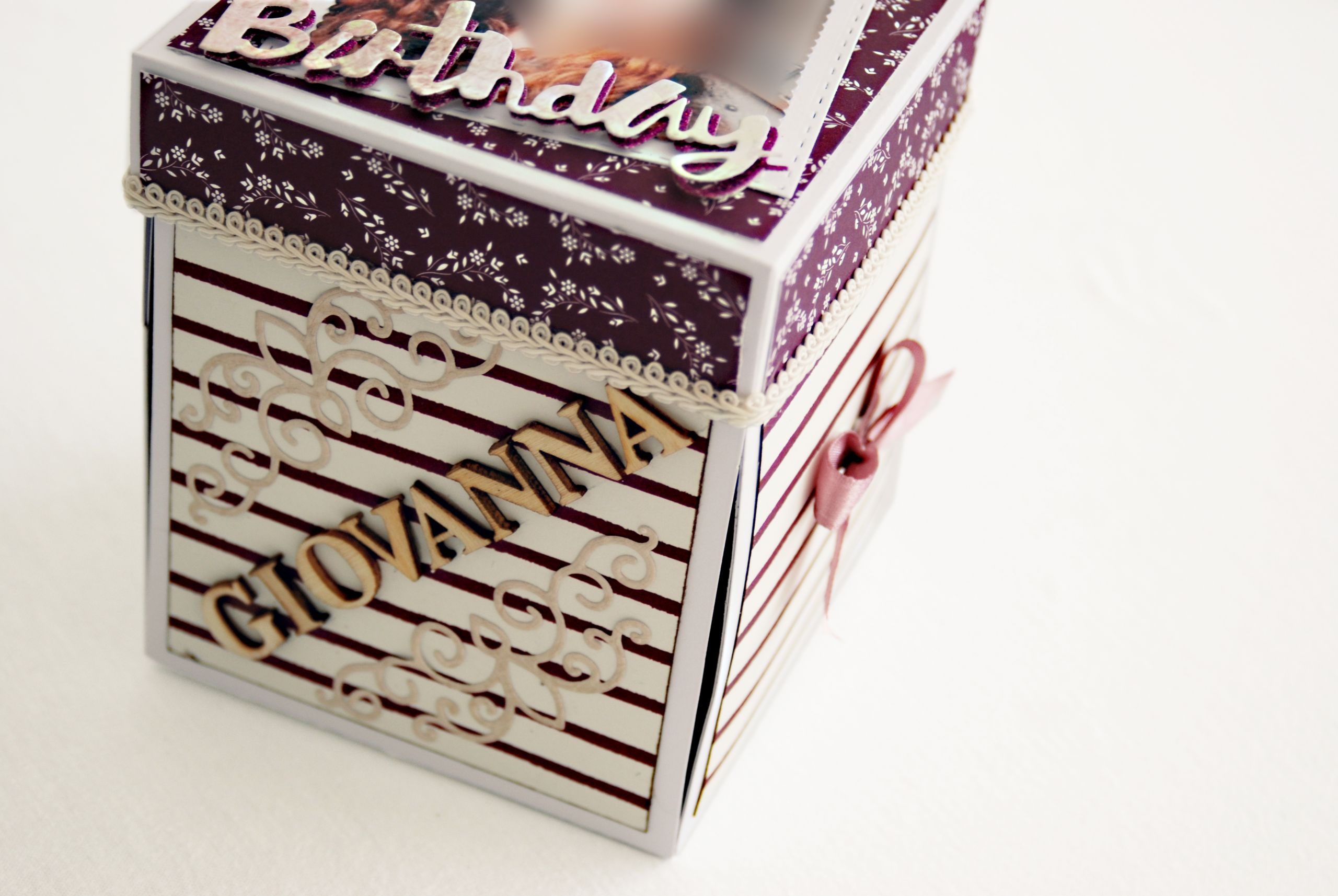 Explosionsbox zum 18ten Geburtstag Vorgabe zu dieser Box war: für ein Mädchen, zum 18. Geburtstag, Farbe: violett Material: verschiedenste Papiere, ein...